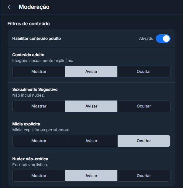 Conteúdo adulto: Conteúdo NSFW não penaliza o alcance do seu perfil. Na verdade, o Bluesky pede que você marque apropriadamente seu post caso contenha conteúdo explícito, pois são os usuários que decidem se querem que tal conteúdo apareça em suas linhas do tempo ou não. Por padrão a exibição vem desabilitada, então caso você produza tal tipo de conteúdo ou arte, instrua seus seguidores sobre essa configuração.
