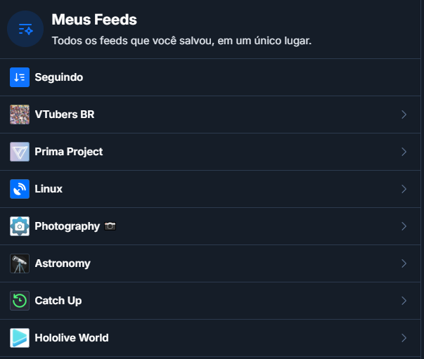 Feeds personalizados: Este é um dos principais meios de encontrar assuntos, como um tipo de busca personalizada. Há feeds que buscam posts de pessoas que curtem os mesmos assuntos que você (como a For You), feeds que buscam posts com certas hashtags (como Artistas BR e VTubers BR), feeds que mostram posts de uma listas de pessoas específicas (como Holostars Talents), até alguns que permitem stalkear pessoas que te seguem (como o Followers). Todos esses podem ser fixados como abas, tanto no desktop quanto no app mobile. A grande maioria dos feeds foram construídos por outros usuários, e com certa pesquisa é possível aprender a criar o seu próprio. Como se aproveitar disso: Inclua hashtags ao se divulgar! Podem ser quantas hashtags quiser, pois isso pode fazer seu posts aparecer em ainda mais feeds. E incentive seus seguidores a usar os feeds! Mas lembre-se também: eles são apenas uma forma de busca, que pode conter certos filtros, então, não dependa só deles. Ao encontrar uma pessoa interessante, siga o perfil!