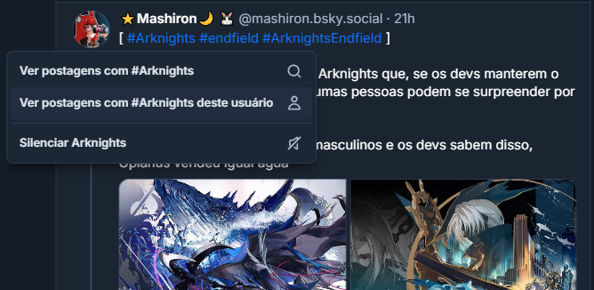 Hashtags: As hashtags são tão úteis que merecem um destaque à parte. Caso use uma hashtag própria para artes, ou uma hashtag genérica como por exemplo #agenda ou #minecraft, o Bluesky permite que você consulte a hashtag tanto globalmente quanto apenas de um usuário. Basta clicar nela e escolher "Ver postagens deste usuário". No app mobile, essa opção aparece ao clicar e segurar na hashtag. Essa opção gera um link próprio também. Veja todos os post da Mashiron sobre Arknights, por exemplo: https://bsky.app/hashtag/Arknights?author=mashiron.bsky.social . É quase um mini-feed próprio 😉